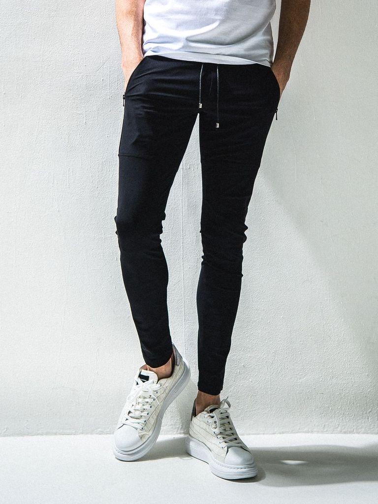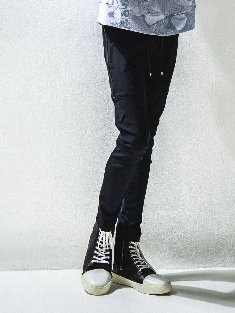 膝から裾にかけてスーパースキニーパンツのように絞り込んだ スーパータイト テーパードシルエットで、膝から下は、かなりタイトなシルエットです。