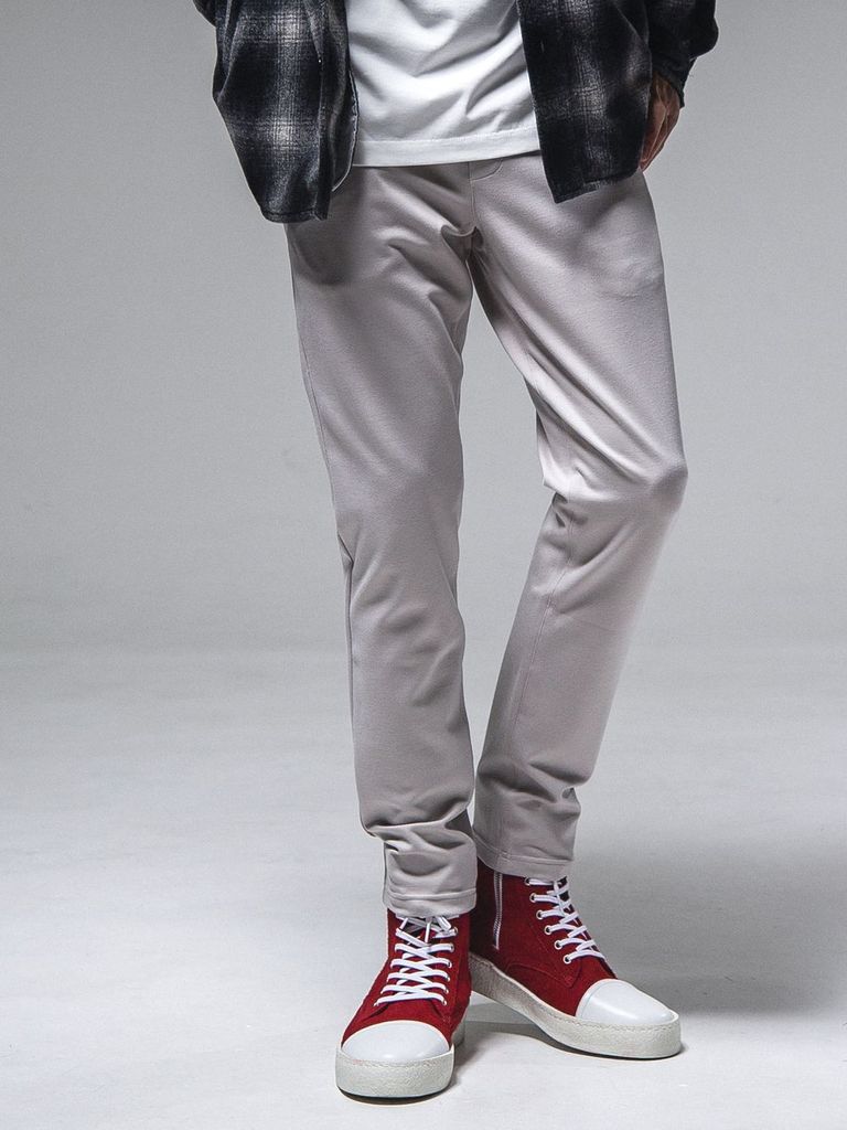 クセがなく、大人の余裕という言葉にふさわしいパンツに仕上げました。素材はレーヨンとナイロンを混紡させたダブルジャージで度詰めで織り上げ、高級感を誘う厚みとレーヨン特有の程よい落ち感、シルクの様な光沢と肌触り吸湿性・吸水性が良く、そして型崩れがしにくいしっかりとした目面が魅力の素材です。