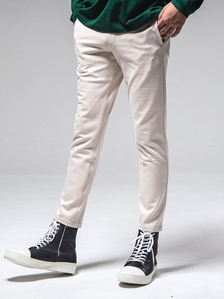 クセがなく、大人の余裕という言葉にふさわしいパンツに仕上げました。素材はレーヨンとナイロンを混紡させたダブルジャージで度詰めで織り上げ、高級感を誘う厚みとレーヨン特有の程よい落ち感、シルクの様な光沢と肌触り吸湿性・吸水性が良く、そして型崩れがしにくいしっかりとした目面が魅力の素材です。
