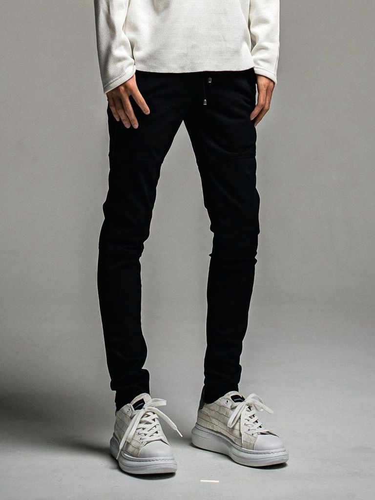 膝から裾にかけてスーパースキニーパンツのように絞り込んだ スーパータイト テーパードシルエットで、膝から下は、かなりタイトなシルエットです。