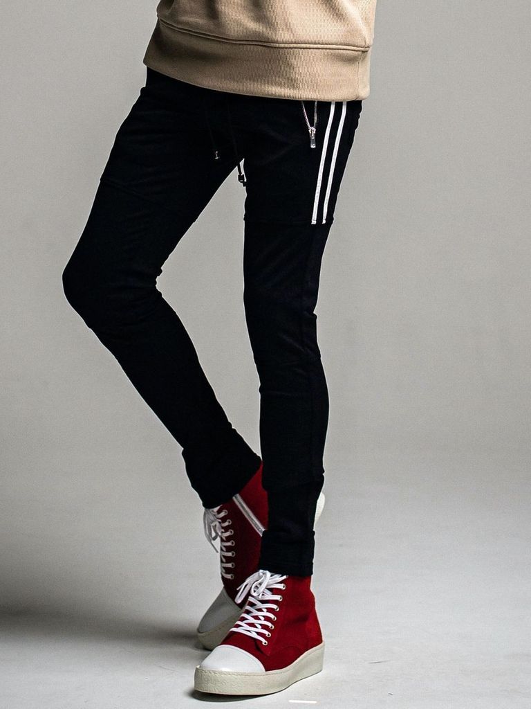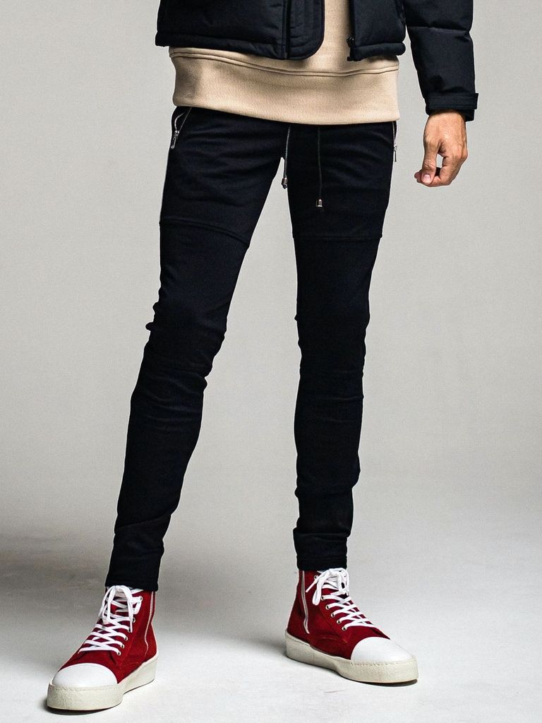 膝から裾にかけてスーパースキニーパンツのように絞り込んだ スーパータイト テーパードシルエットで、膝から下は、かなりタイトなシルエットです。