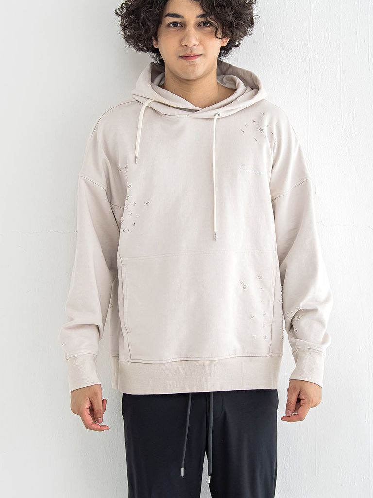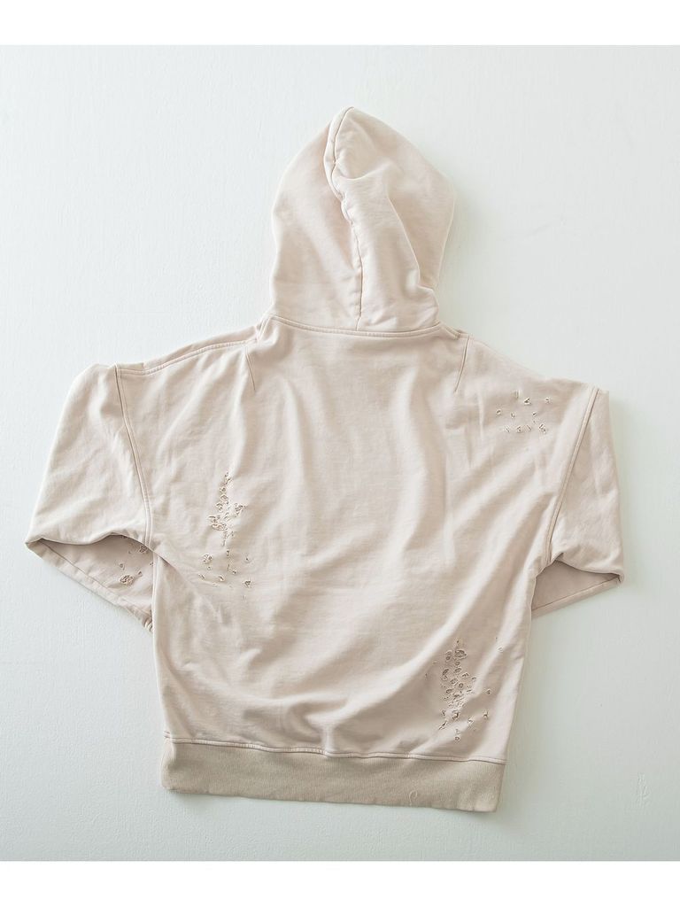 カットソーの聖地和歌山でシルク加工を施した毛羽の少ない超長綿を使用し、 型崩れしにくく、収縮性もないぐらい高密度に織り上げています。高密度に織り上げることにより、なめらかな質感と糸自体の光沢が合わさり、 コットン100%に見えない高級感のあるファブリックに仕上げることで昔ながらのぬくもりを感じるメイドインジャパンの裏毛の良さが表現されています。2枚合わせの大きなフードと、袖とサイドの切り替えとカッティングにこだわり エッジの効いたデザインに仕上げています。レザー加工で縦糸を焼き、ランダムで計算されたクラッシュ加工を施しヴィンテージ感のある仕上がりになっています。☆