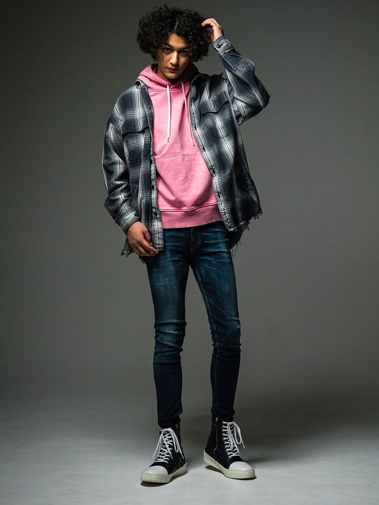 カットソーの聖地和歌山でシルク加工を施した毛羽の少ない超長綿を使用し、 型崩れしにくく、収縮性もないぐらい高密度に織り上げています。高密度に織り上げることにより、なめらかな質感と糸自体の光沢が合わさり、 コットン100%に見えない高級感のあるファブリックに仕上げることで昔ながらのぬくもりを感じるメイドインジャパンの裏毛の良さが表現されています。2枚合わせの大きなフードと、袖とサイドの切り替えとカッティングにこだわり エッジの効いたデザインに仕上げています。特殊反応染めを行い特殊加工で色を落とし、 ケミカルウォッシュ加工に仕上げています。