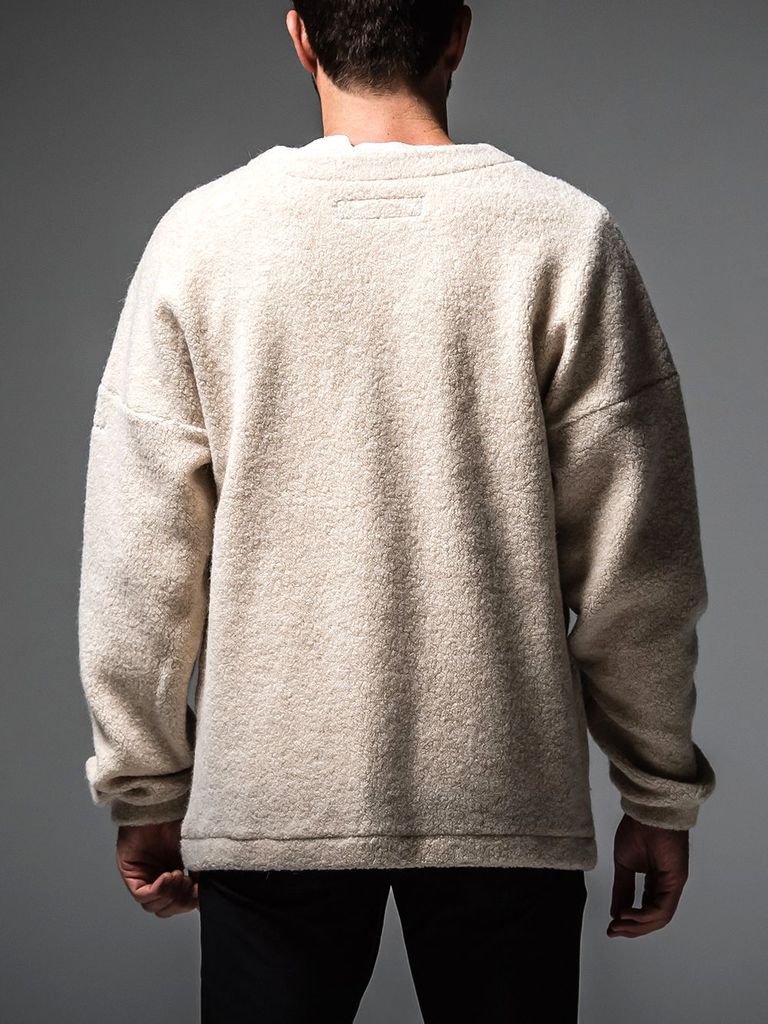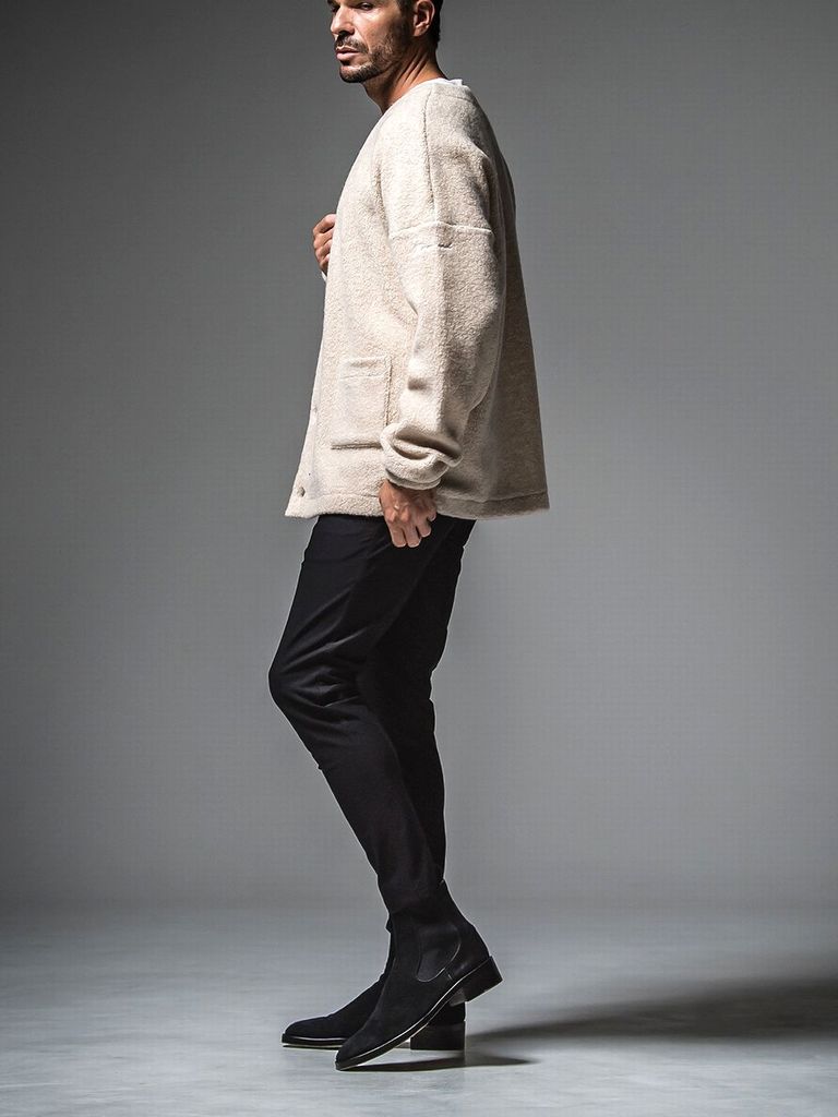 素材は愛知県一宮で作成した、丸網機で作成したボアパイル 、空気を含み編みたて、軽量感を表現しております。