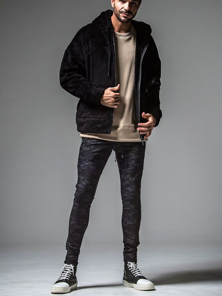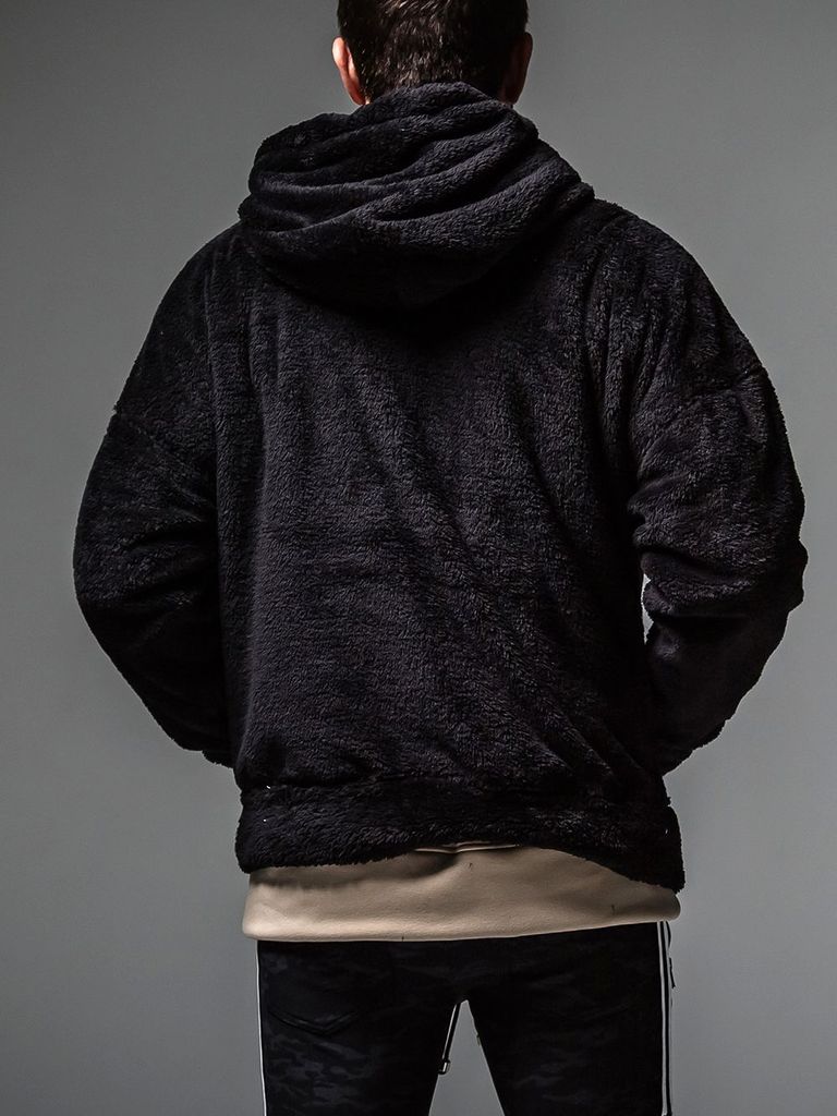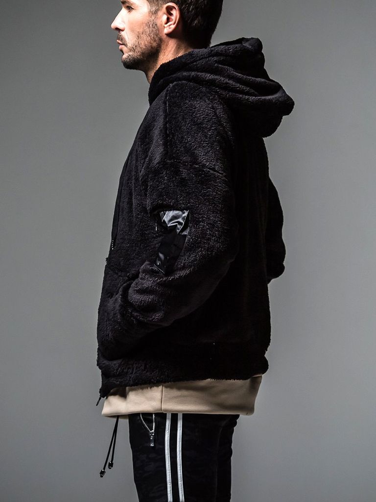 アウターに近い滑らかで厚みのある両面ボアフリース、大きなフードとシンプルなサイドパッチポケット ナイロンミリタリーポケット がアクセントです。