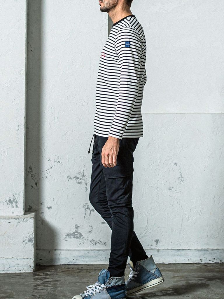 邪魔にならないスタイリッシュな印象をあたえてくれるシルエットは、定番のラインパンツより、腿周りをややゆとりを持たせ、