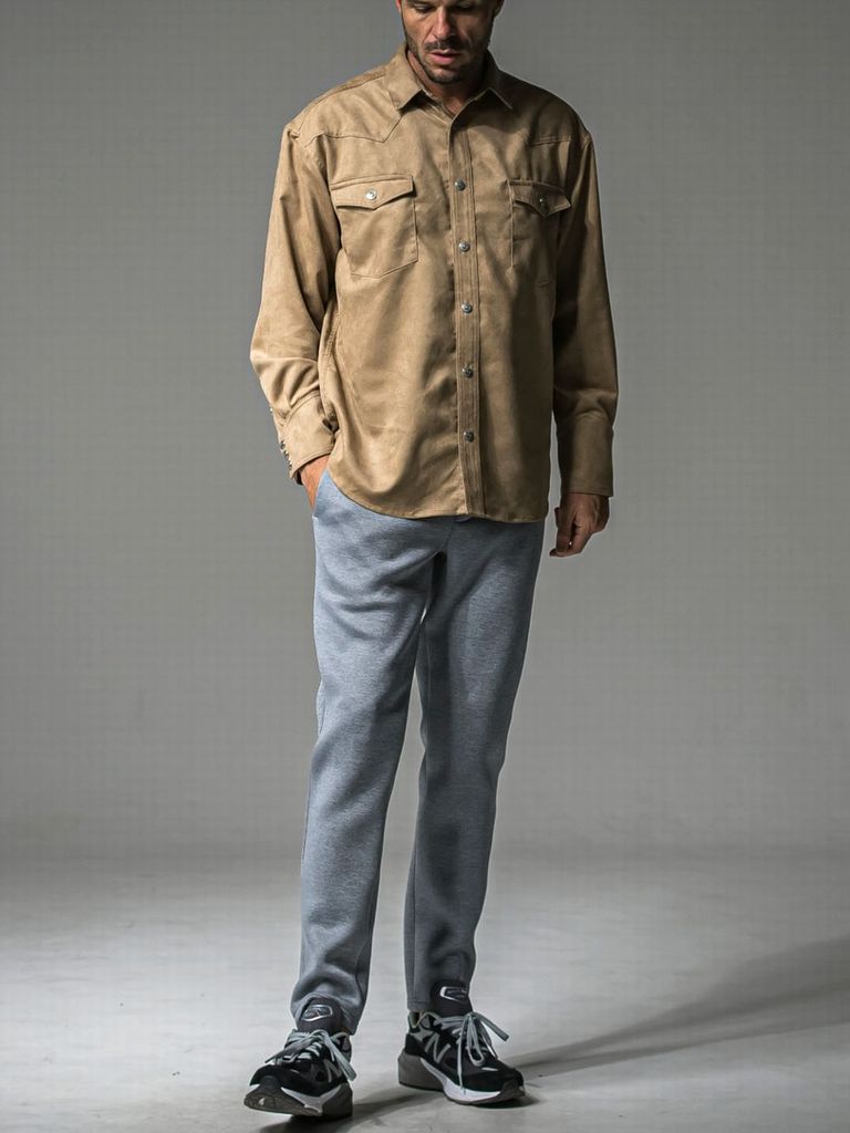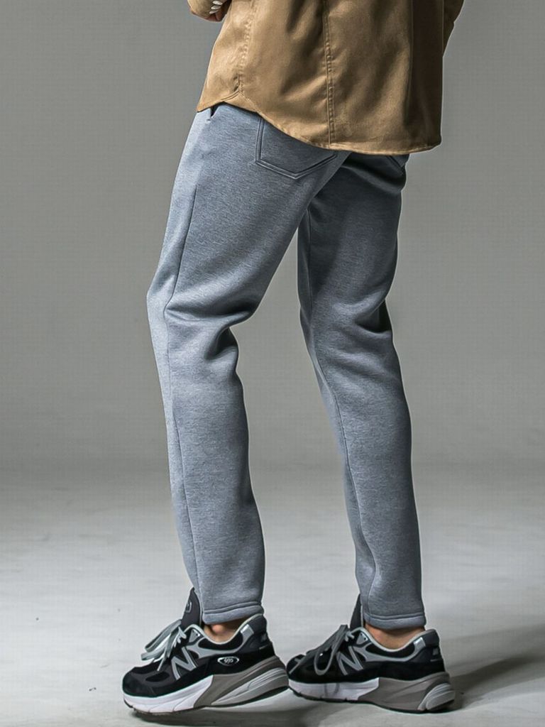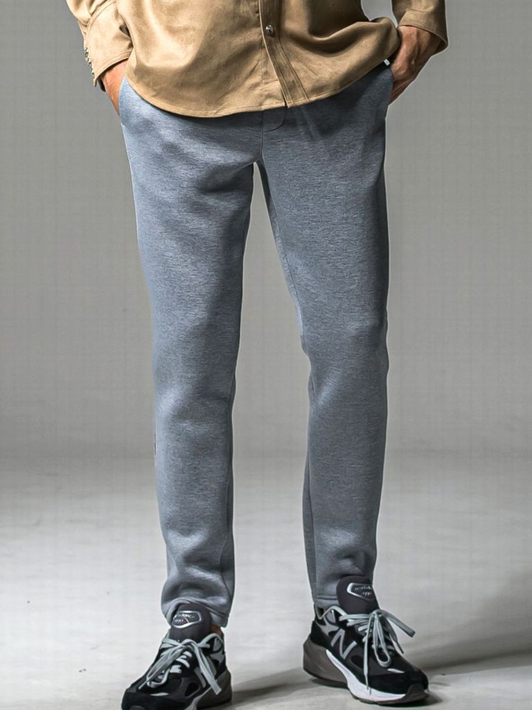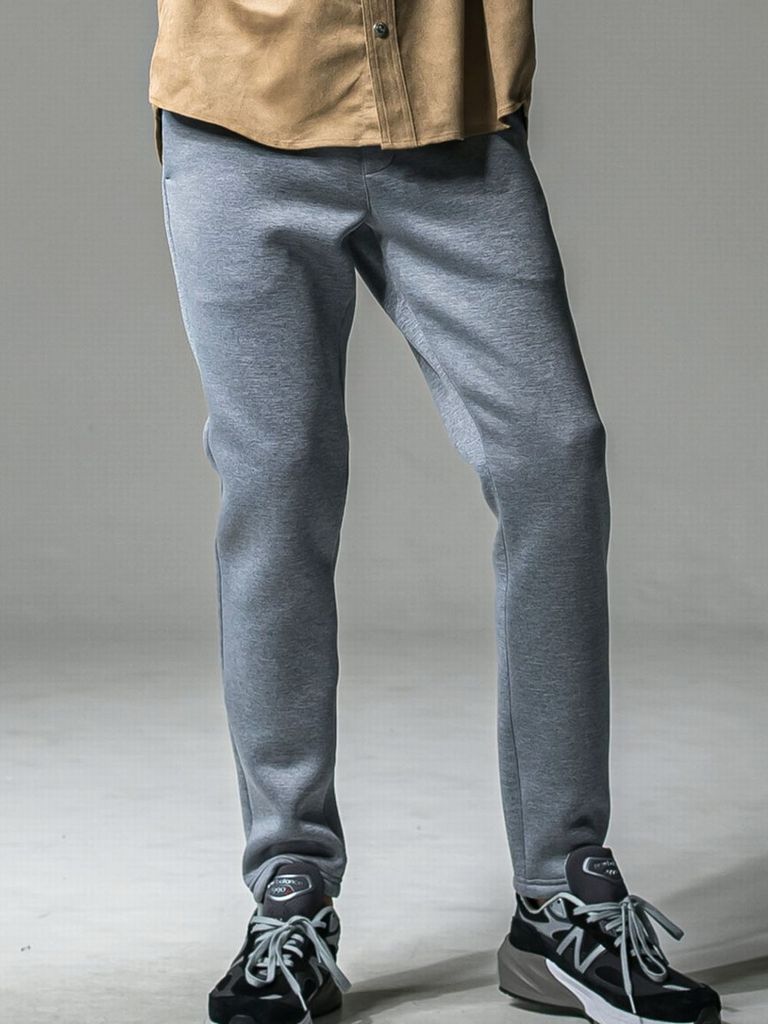 シルエットは腰、ヒップ周りはタイト、腿周りはゆったりしています。裾に向かってテーパードさせたシルエットです。吸湿速乾といった機能に加え、膝が出にくく、型崩れがしにくい素材です。