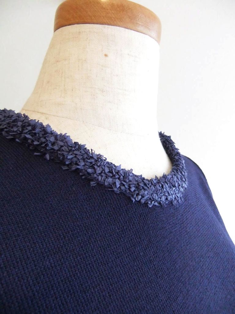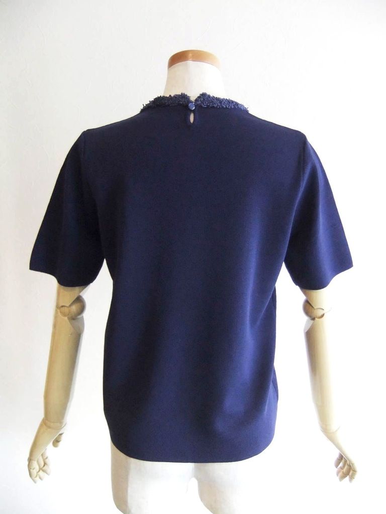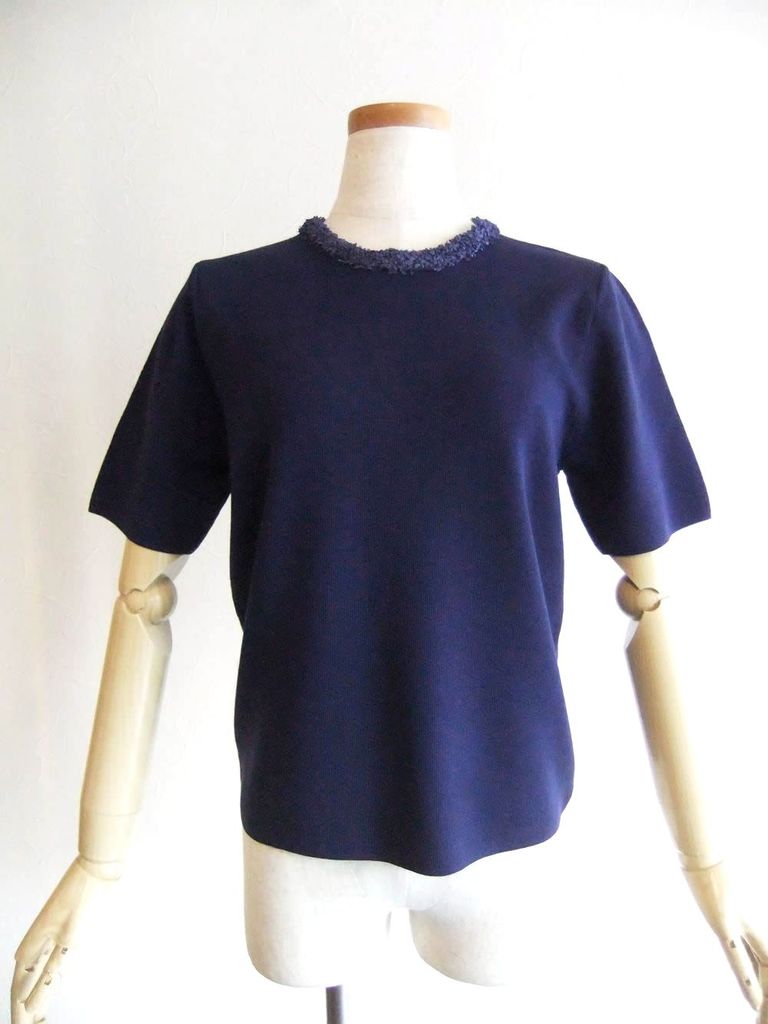 ☆シンプルな半袖のニットの襟元にペーパーヤーンのリボンフリルをあしらった上品なプルオーバー。