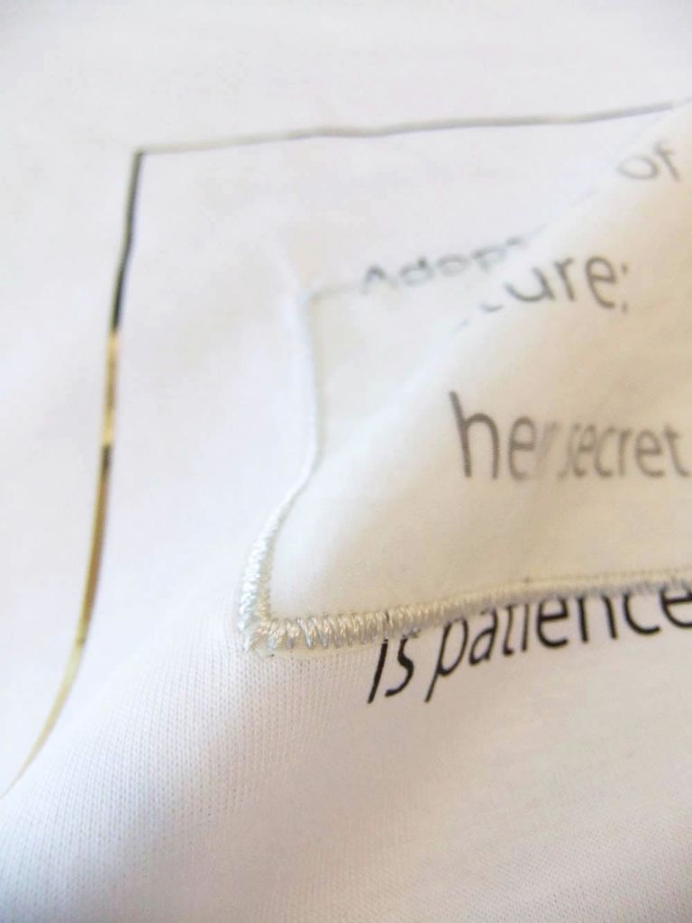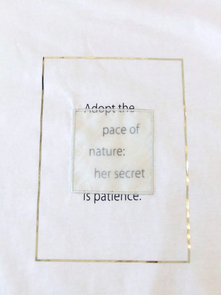胸に四角い箔プリントを施し、ポリエステルオーガンジーをロゴプリントの上にパッチしてポイントに。