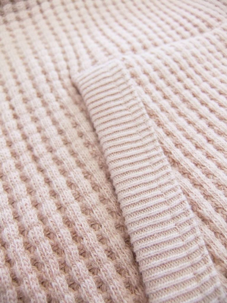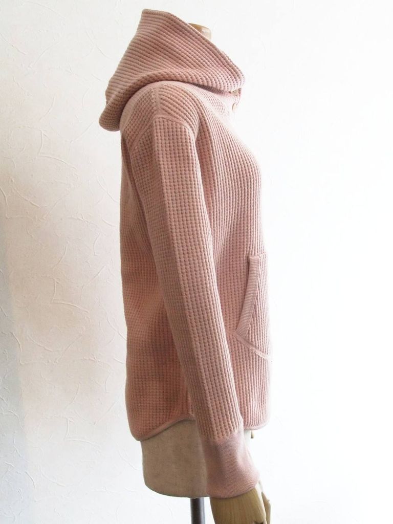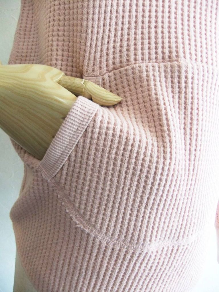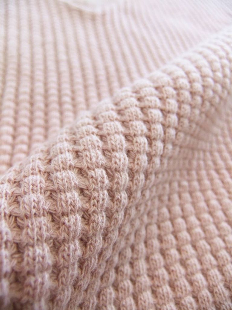 ☆大きな凸凹した素材がかわいい♪  素材はラフィの糸19番/-の絶妙な糸の太さで編みたてたワッフル。 ワッフル柄も通常のものより大きめで、 すこしとろみのあるコットン素材。カジュアル過ぎず女性の体が美しく見えるようにシルエットにこだわりました。 デニムとの相性はもちろん、スカートにもバランス◎です☆